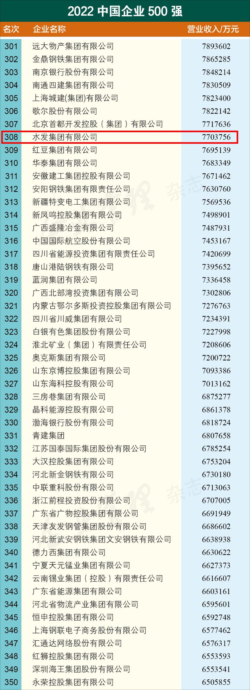 2022年9月6日,中國企業(yè)聯(lián)合會(huì)、中國企業(yè)家協(xié)會(huì)在京舉辦新聞發(fā)布會(huì),發(fā)布了“2022中國企業(yè)500強(qiáng)”榜單。作為山東省屬國有企業(yè)的水發(fā)集團(tuán)本次排名位列第308位,較去年提升126位。